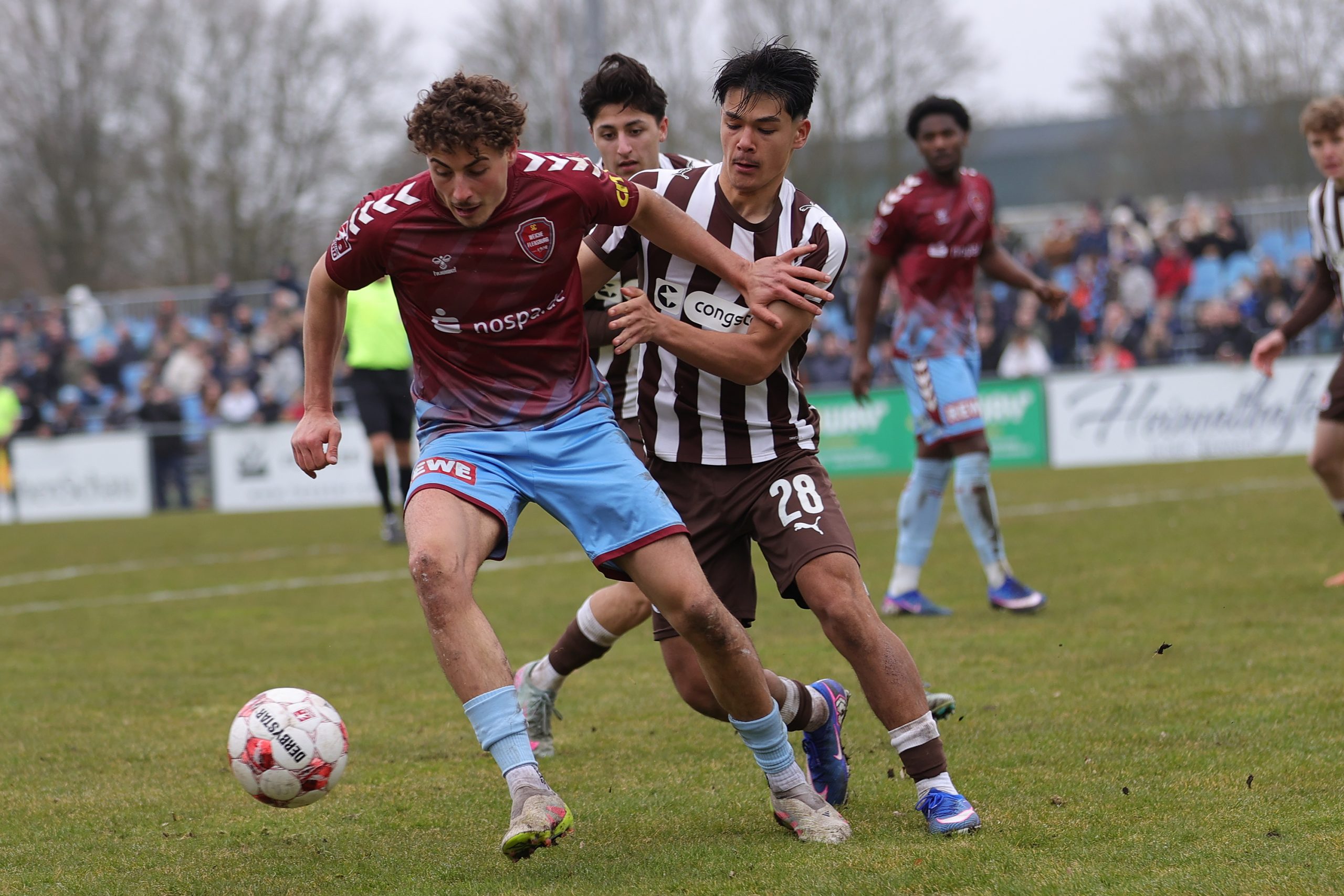 Nach langem Warten hat der SC Weiche Flensburg 08 endlich wieder ein Heimspiel absolvieren können. Am 27. Spieltag der Regionalliga Nord trennte sich Weiche beim ersten Auftritt vor eigenem Publikum seit dem 6. Dezember 2025 von der U 23 des Bundesligisten FC St. Pauli mit einem 1:1-Remis. Vor 1.297 Zuschauern im Manfred-Werner-Stadion – Saisonheimbestwert – litt die Partie am trüben und kühlen Samstagnachmittag unter den unebenen Platzverhältnissen, die ein kontrolliertes Spiel kaum zuließen. Während Gäste-Trainer Karsten Neitzel von einem letztlich gerechten Ausgang der Partie sprach, sagte unser Cheftrainer Tim Wulff: „Vielen Dank für die Unterstützung heute! Wir hätten Euch gern drei Punkte geschenkt. Es sollte uns im Endeffekt nicht gelingen. Dennoch wirft uns das nicht um. Es ist ein Punkt mehr für die Tabelle. Wir müssen weiterarbeiten.“